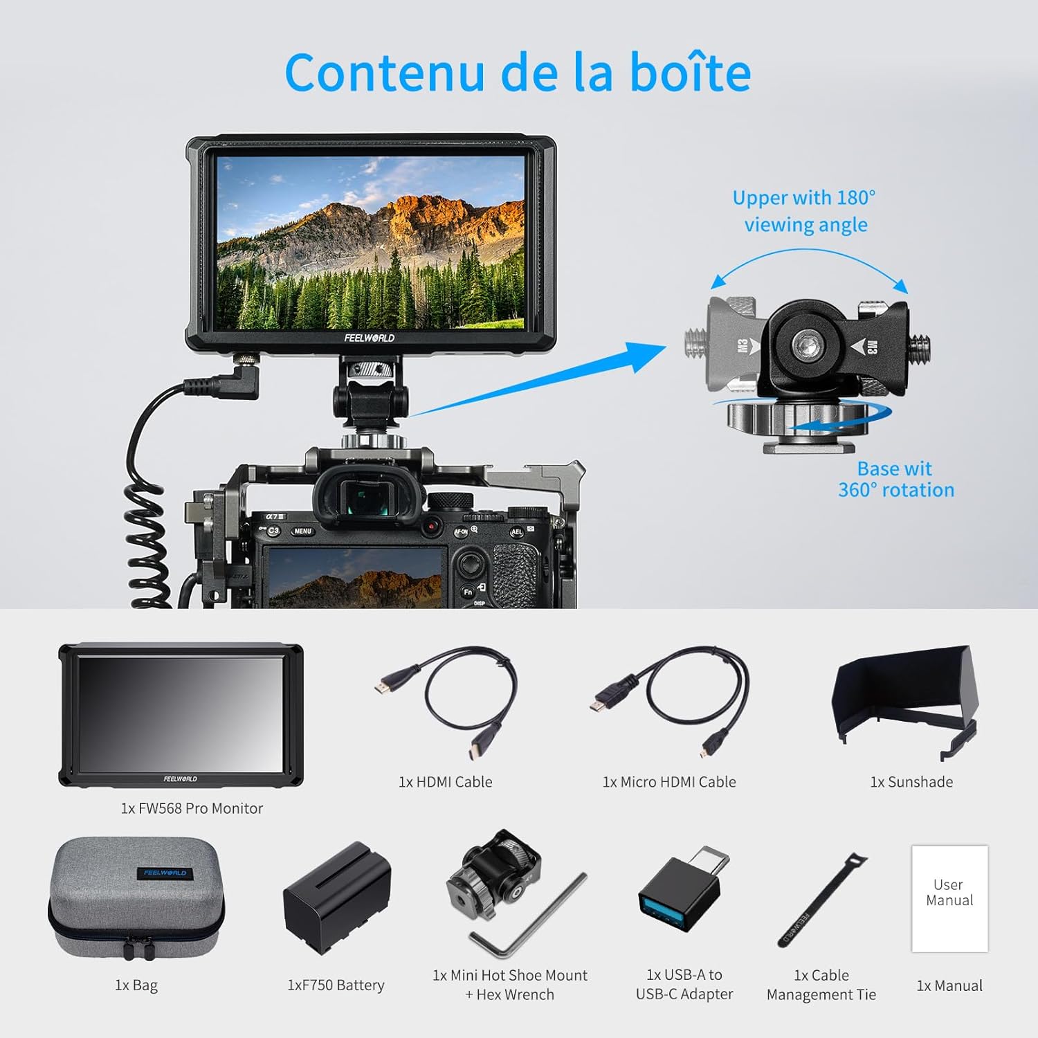 FEELWORLD FW568 PRO Ecran Appareil Photo 6 Pouces 1200 Nits Moniteur Externe Caméra avec Batterie F750 4400mAh et Sac de Transport, Waveform, 3D LUTs, 1920 X 1080 IPS avec Entrée/Sortie 4K HDMI,TYPE-C