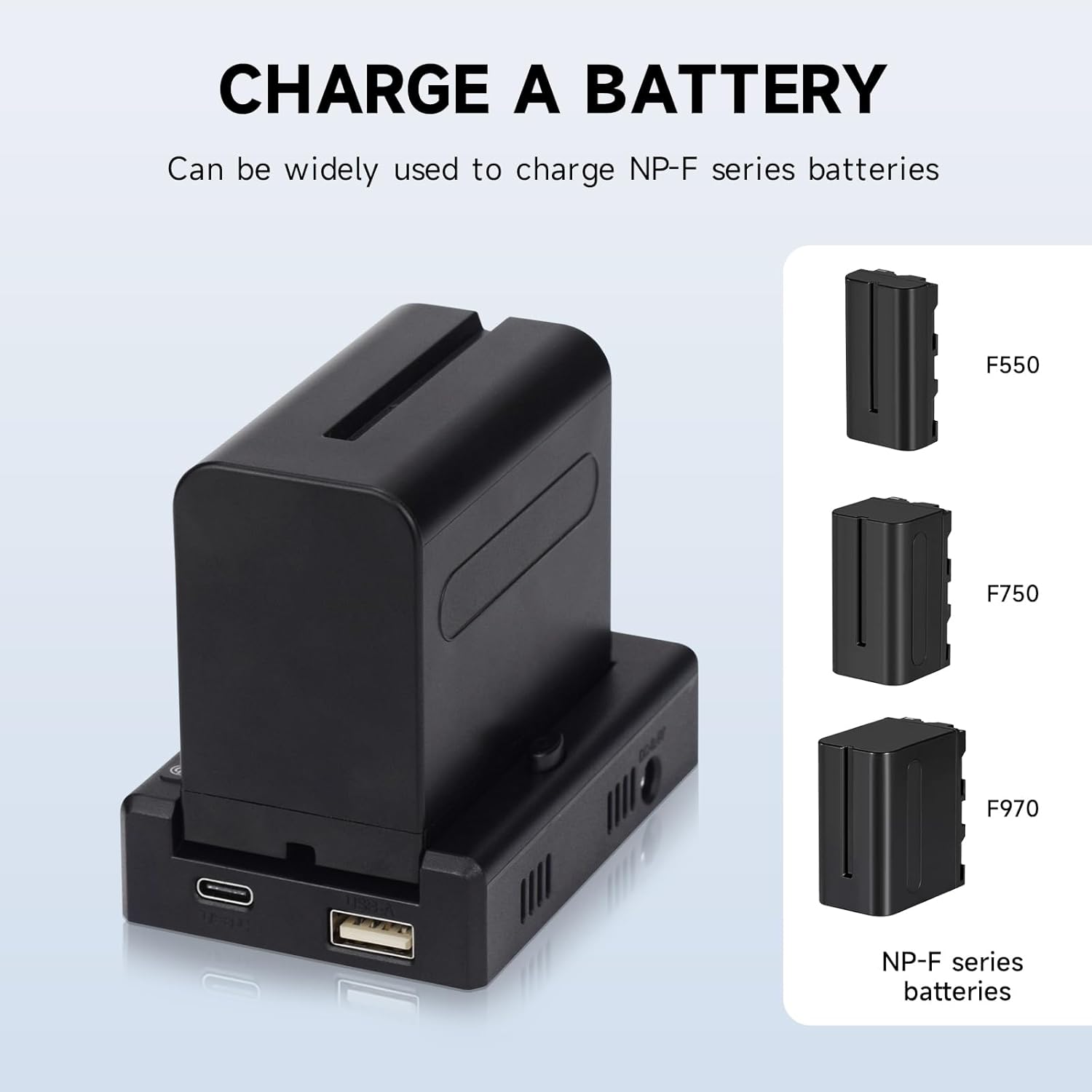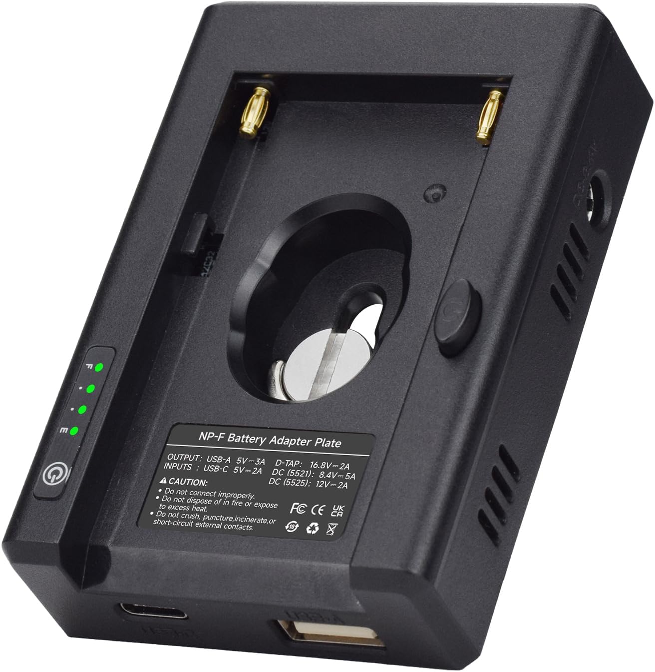 Entrée et sortie : il offre plusieurs ports de sortie, y compris un port de sortie 12 VDC (5,5/2,5 mm), un port de sortie 8,4 VDC (5,5/2,1 mm), un port de sortie D-Tap et un port de sortie USB-A pour alimenter la caméra et les accessoires. Remarque : le port de type C ne peut être utilisé que comme entrée, pas comme sortie. Affichage LED de la batterie : l'adaptateur d'alimentation est équipé de quatre LED pour surveiller la puissance restante, visualiser la connexion de la batterie et afficher la durée de vie de la batterie lors du chargement des plaques de batterie adaptateur. Montage et démontage faciles : fixez la plaque sur le support de l'appareil photo avec une vis à ailettes 1/4"-20 ou deux vis hexagonales 1/4"-20. Le connecteur 1/4" se fixe à n'importe quel support, et le connecteur sabot vous offre la flexibilité d'un montage et d'un démontage rapides. Les tampons en caoutchouc offrent une stabilité supplémentaire et protègent votre équipement des rayures. Matériaux soigneusement travaillés : la plaque de batterie NP-F est fabriquée en alliage d'aluminium de haute qualité, ce qui assure durabilité et qualité. Les contacts électriques sont plaqués or pour assurer une meilleure conductivité. Chaque port de sortie est protégé contre les courts-circuits et les courants élevés pour éviter d'endommager l'appareil photo. Contenu de la livraison : l'adaptateur peut être utilisé comme chargeur pour charger les batteries de l'appareil photo, et la batterie peut être utilisée comme source d'alimentation pour charger les ordinateurs, les téléphones portables et autres accessoires lorsqu'elle est connectée à l'adaptateur. Contenu de la livraison : 1 plaque adaptateur de batterie NP-F, 2 vis 1/4", 1 manuel d'utilisation